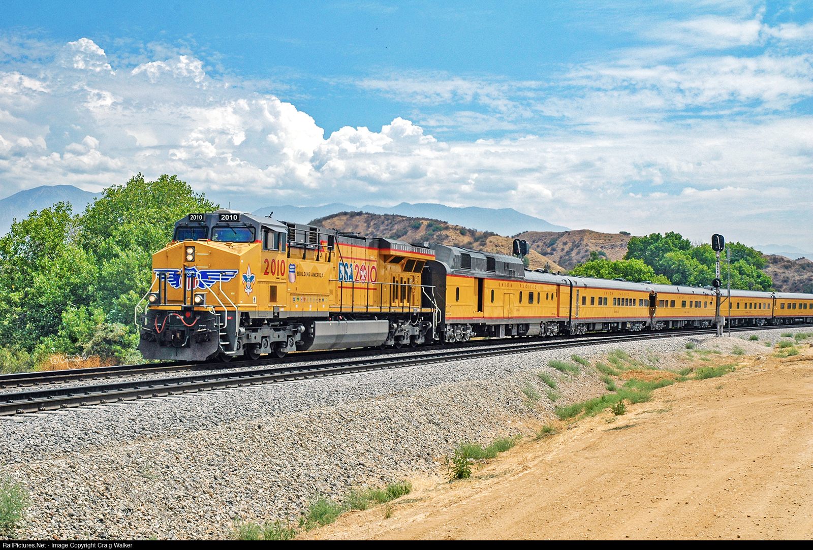 See beautiful diesel locomotives in UP's traditional armour yellow livery and special commemorative paint schemes pulling long trains of yellows cars reminiscent of the days when UP domeliners seemed to go Everywhere West.