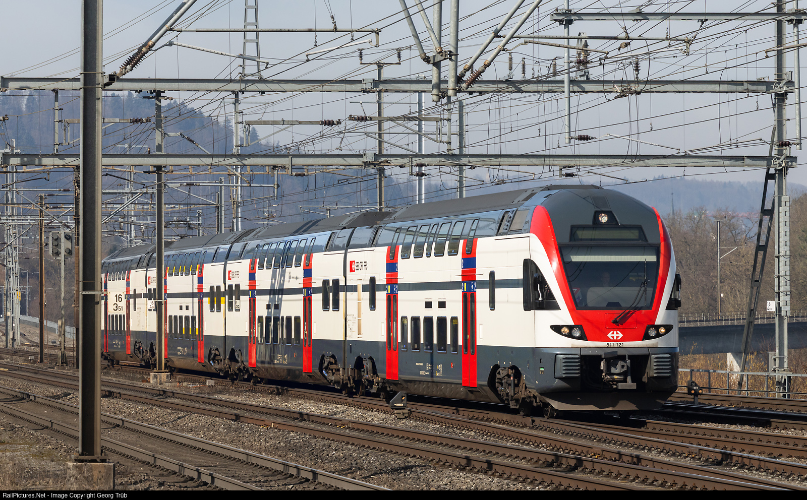 | Short doubledeck train for Interregio/RegioExpress services "IR Dosto" RABe 511 # 121 of the SBB is running the RE 4819 of the line RE37 from Aarau via Lenzburg to Zürich through Killwangen-Spreitenbach. The SBB has 24 of this trains, which have now an upgraded interior in first class and an improved coupler for easier coupling in curves. They will mainly operate together with RABe 512 trains in the future to form 250 meter long trains. The outer paintwork will also be adapted to the RABe 512. |