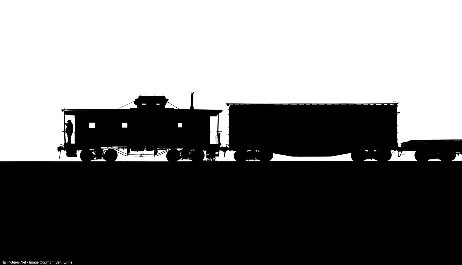 A brakeman is silhouetted on the back of caboose 3 as he controls a reverse movement on Steptoe Fill.