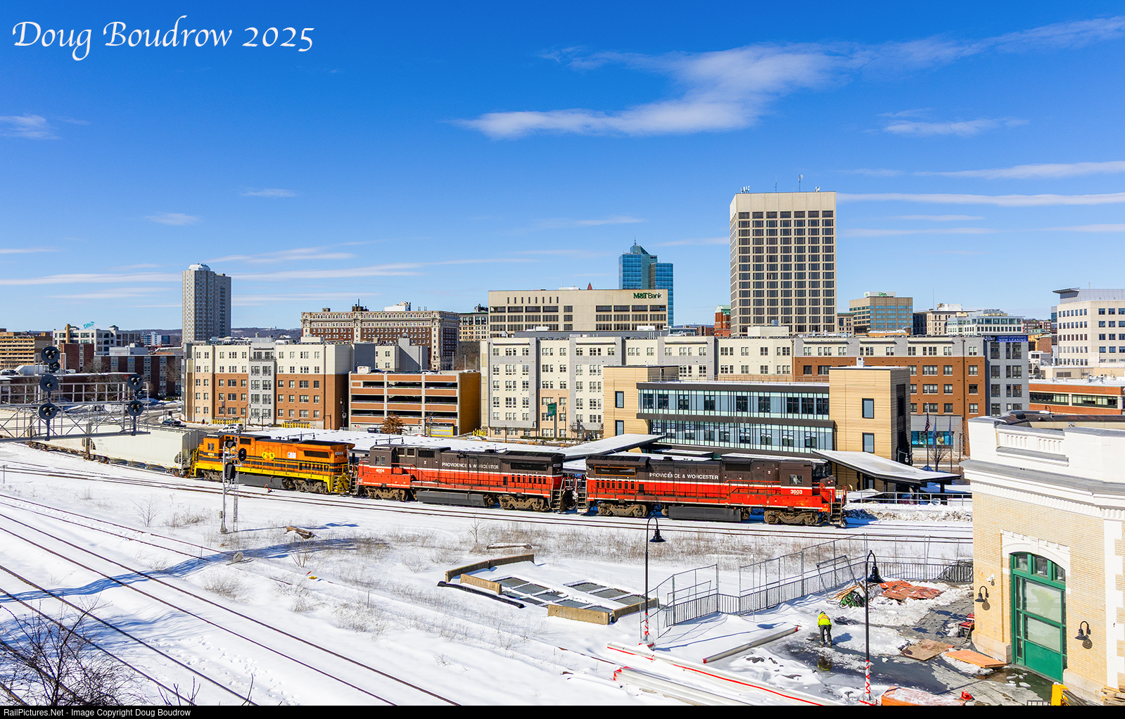 Providence & Worcester train WOGR is seen leaving Worcester and passing Union Station. The train will run to Gardner where it will interchange with Berkshire & Eastern before returning South to Worcester.