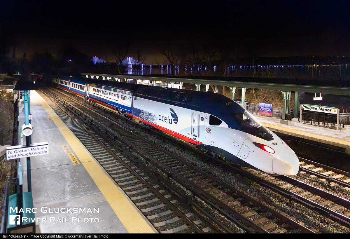 Acela By The TZ Bridge. On the night of Wednesday, February 26, 2025, Amtrak's Alstom Acela II Train Set 20 (AMTK 2135/2130) being delivered from the Alstom Factory in Hornell, New York to Philadelphia, Pennsylvania (14-19 are still on the factory) when it passed through Philipse Manor, New York. The set is being towed by a pair of P42DCs. The Acela II program will ultimately deliver 28 high speed train sets to Amtrak, and testing is still ongoing. In the background the new Tappan Zee Bridge (Mario M. Cuomo Bridge) is lighted in the background as it passes through the MTA Metro-North Railroad Philispe Manor Station.