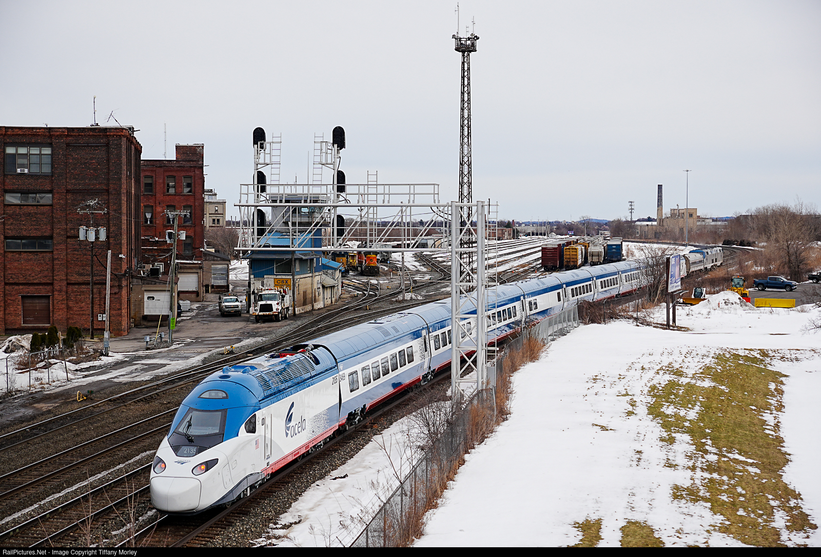 Another Eastbound Alstom Acela II delivery (Hornell, NY to Philadelphia, PA) passes through the city of Rochester, NY and brightens up this glum February day.