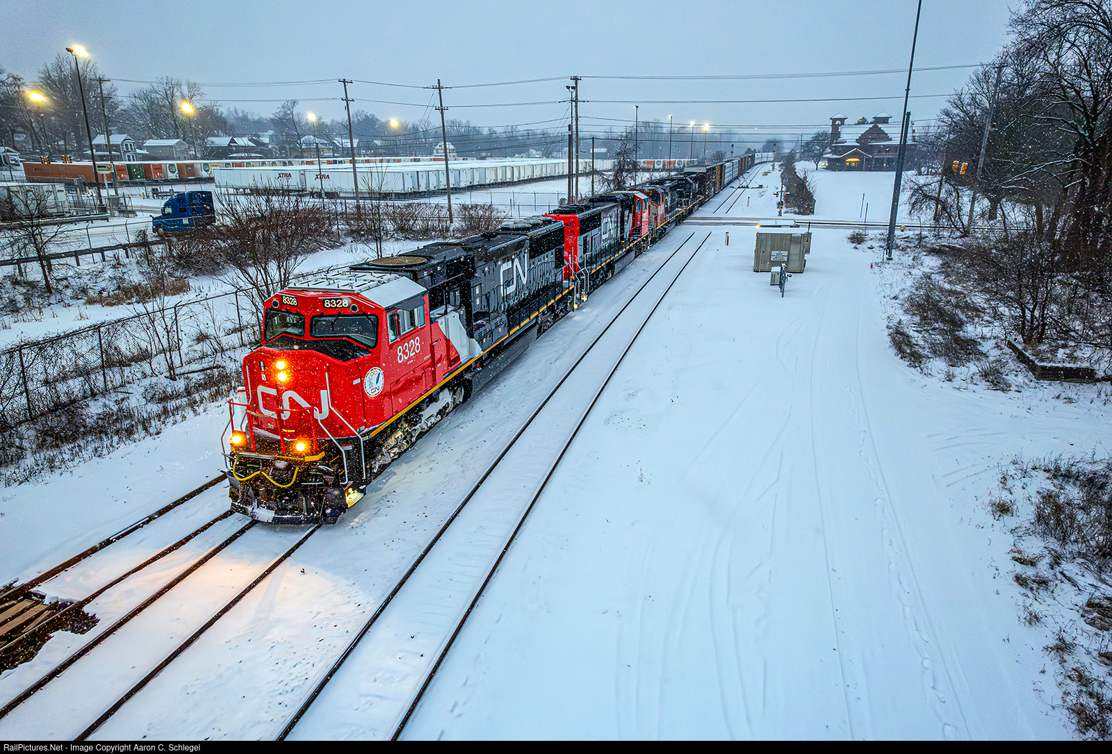 | A492 rolls East through CN BARRON in Battle Creek. This set of fresh SD75IACC's are leading out of Kirk destine for Canada. The CN 8328 was formerly the CN 5707 and the CN 8317 was the CN 5664. The appearance on the outside hasn't changed much other than paint. On the inside however the control stand and computer arrangement and programing is that of an SD70M-2 and is nothing like the old SD75I's. |
