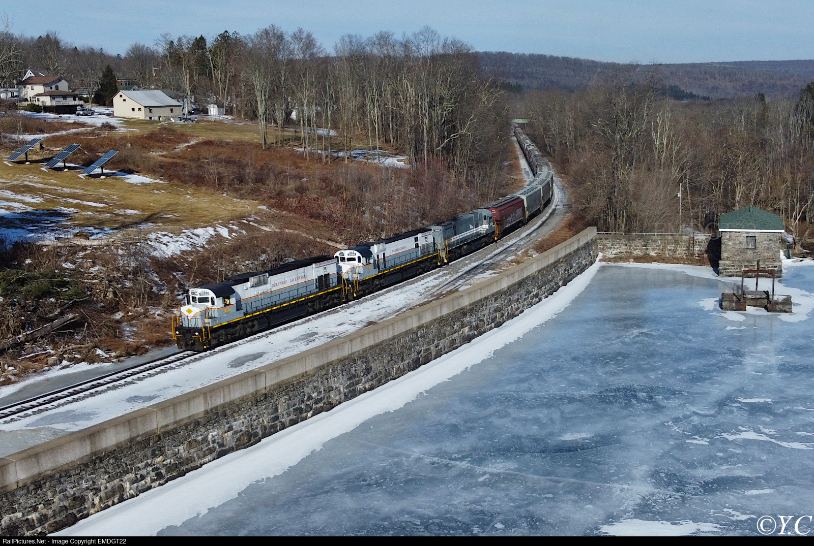 Delaware Lackawanna PO74 passes the frozen Roaring Brook Reservoir as it heads southeast out of Scranton. Today's consist includes C636 #3642, C630M #3000, and M630 #3007. The lead unit is the last surviving Alco of its kind. One of 34 built in the US, it served Penn Central, Conrail, and the Delta Bulk Terminal in California before its purchase by the Delaware Lackawanna. It wore its Conrail blue paint until 2006, when it received the DL's corporate scheme seen in this photo.