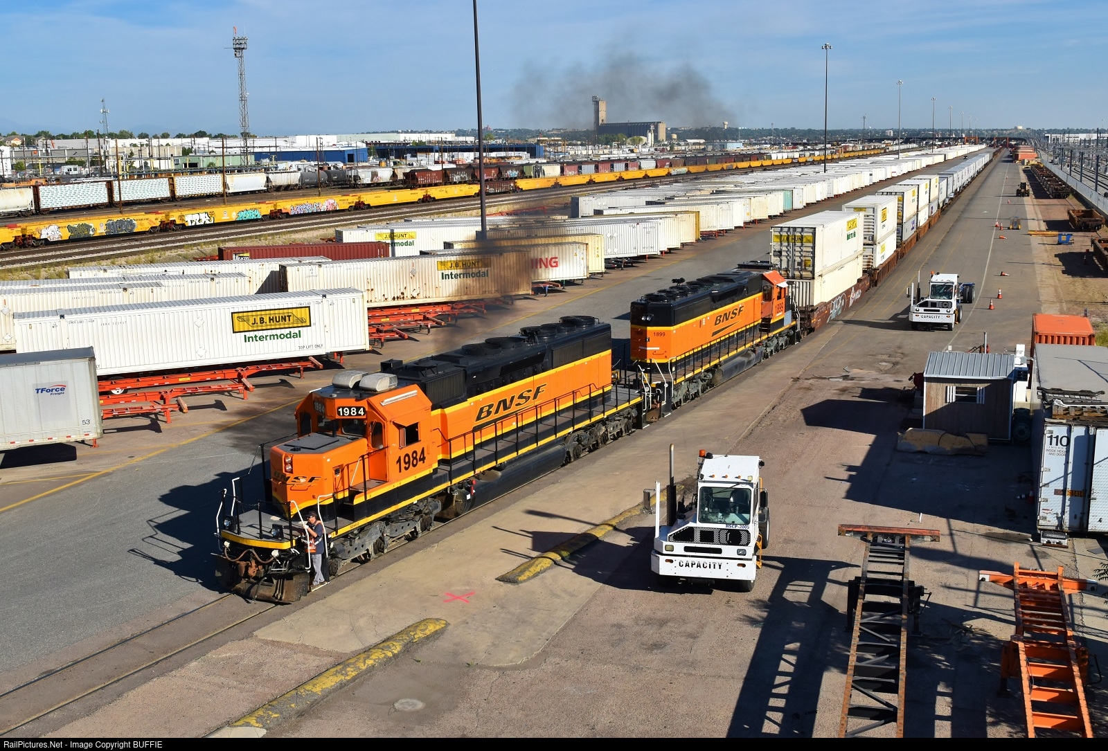 | BNSF 1984 (SD40-2) notches up to pull a cut of stack cars out of the intermodal yard in Denver, Colorado.