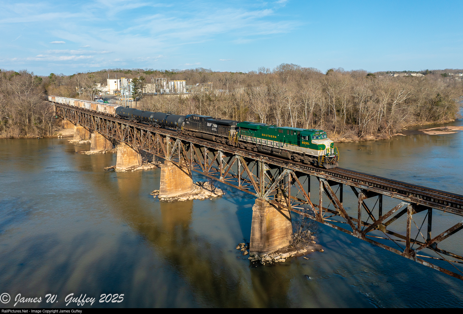 | The Southern heritage unit leads 15R southward across the Catawba River at the railroad location of Celriver, former site of a large Celanese plant. The train has just worked Charlotte and got a fresh crew for the home stretch to Columbia. |