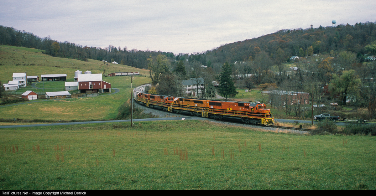 Maryland Midland train UBHF (Union Bridge-Highfield, MD turn) negotiates the horseshoe curve in Sabillasville, MD which is one of the most iconic shots on the railroad. Look through the trees and you'll get a feel for the 2 percent grade the train is descending headed east for Union Bridge. A couple of big changes occurred not long after this shot was taken in November 2024. First, the last remaining SD40M-2 which is second out in this consist had its engine block disabled to comply with Genesee & Wyoming's EPA settlement; SD50s are now the only six-axle power on the line. Second, the bulk of CSX interchange now occurs on the east end at Emory Grove, MD (Glyndon on a map) making big consists such as this one a thing of the past. The UBHF trains are now typically two units and a handful of cars.