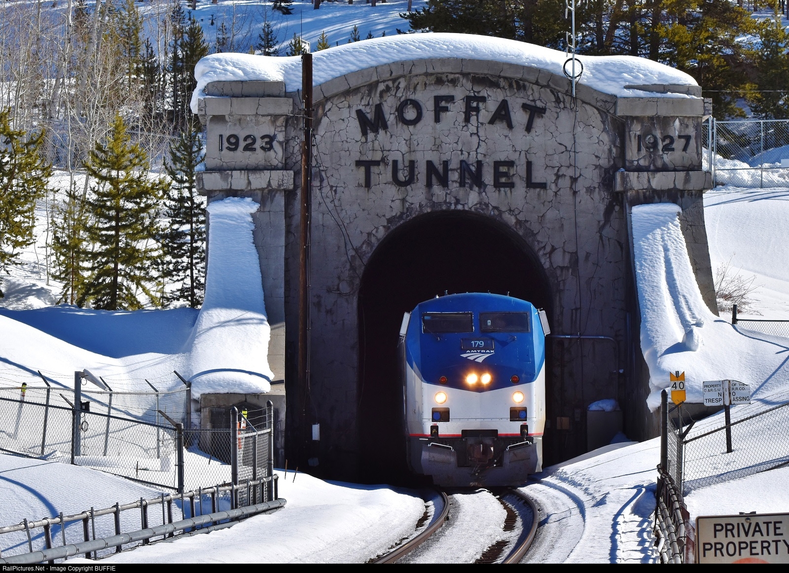 | The California Zephyr 5 train exits the west portal of the Moffat Tunnel as it heads towards Fraser, Colorado. |