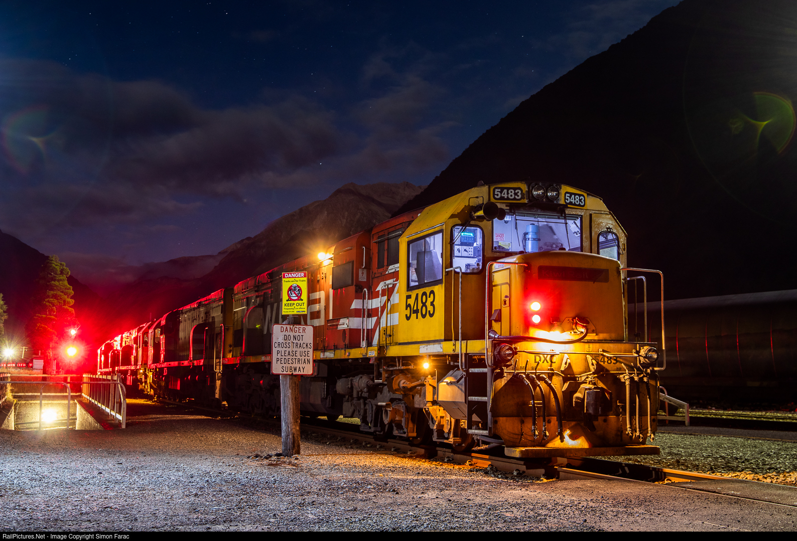 With stars shining and lights glowing all around, the 4 bankers wait patiently for 828 to arrive. Once here, the bankers will attach to the head of the train and assist in getting the loaded train up to Arthurs Pass. The 4 DXC class locomotives are bankers are based at Otira and assist in getting all loaded trains up the 1 in 33 grade of the 8.5km long Otira tunnel to Arthurs Pass.