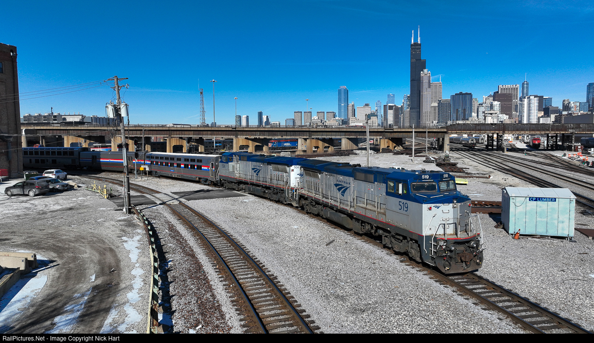 Going Old School. Under the watchful eye of the Chicago skyline, the Cardinal's trainset is slowly making its way around the curve at CP Lumber, preparing to make its move to the yard. On this beautiful afternoon, it features a pair of Dash 8's up front, that were added on at Beech Grove, IN. Rumors continue to circulate about the possible retirement of the Amtrak Dash 8's, but they continue to earn their keep.