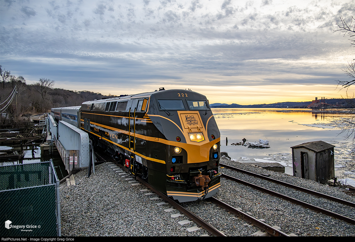 Metro-North's 40th Anniversary "New Haven Railroad" heritage-wrapped GE P32AC-DM, MNCW 222, leads train 841 over the Wappinger Creek Railroad Bridge as the sun sets at New Hamburg, New York on February 28th, 2025.