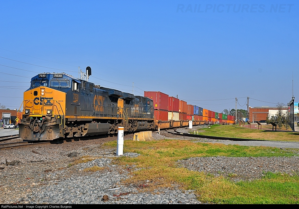 | A great day to hang out by the tracks starts to draw to a close as an Etowah, Tennessee bound intermodal glides past the railfan platform located in downtown Cordele. The lead locomotive was rebuilt from CSX 21 which was originally constructed in 1994. |