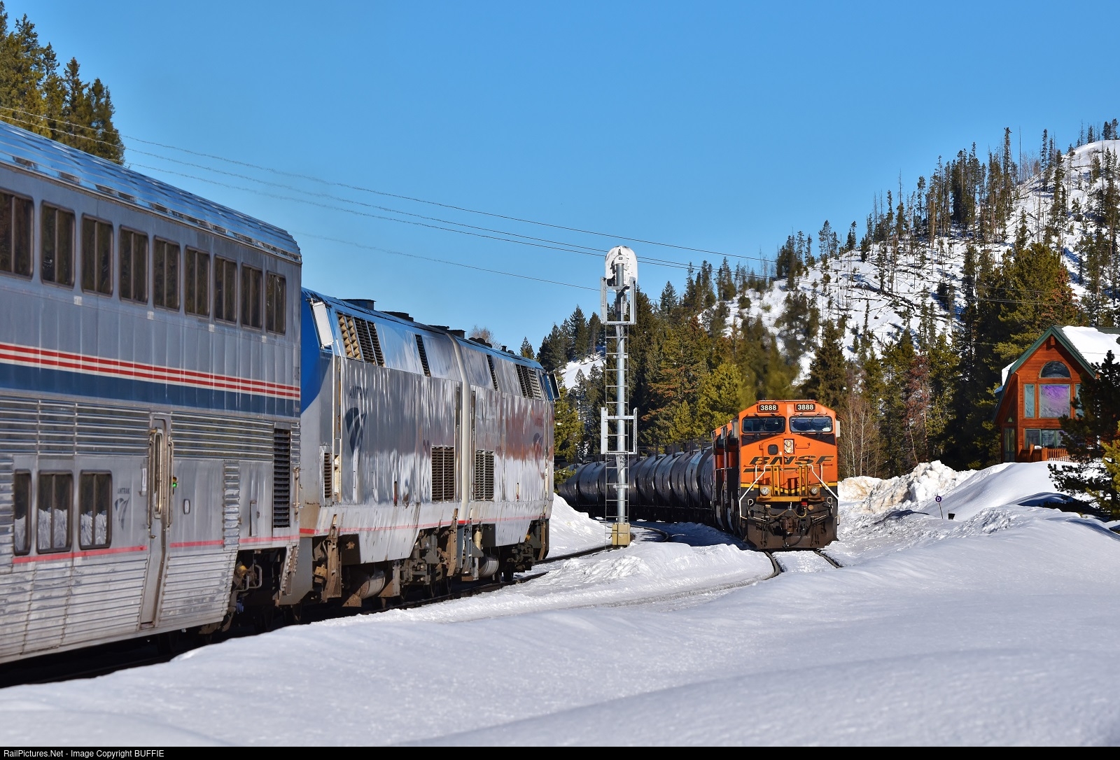 Amtrak's Winter Park Express Ski Train meets a BNSF oil can train waiting on the siding in Winter Park, Colorado.