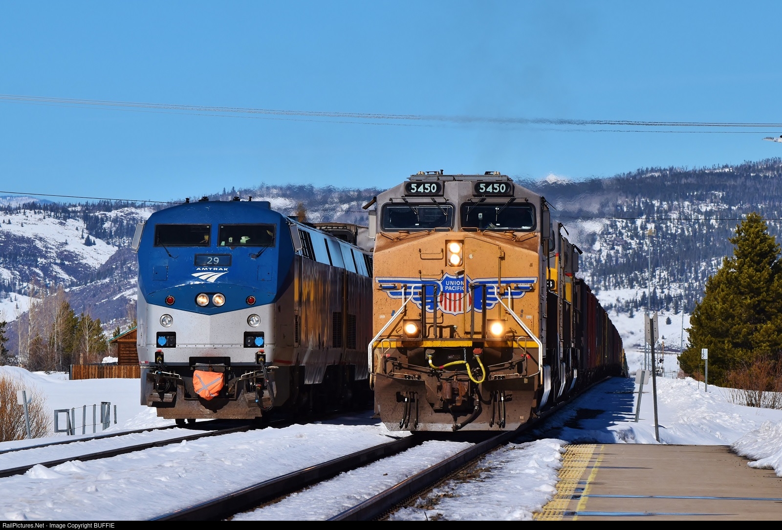 UP 5450 (ES44AC) leads a freight past the Amtrak's Winter Park Express Ski Train as it sits on the siding in Fraser, Colorado.