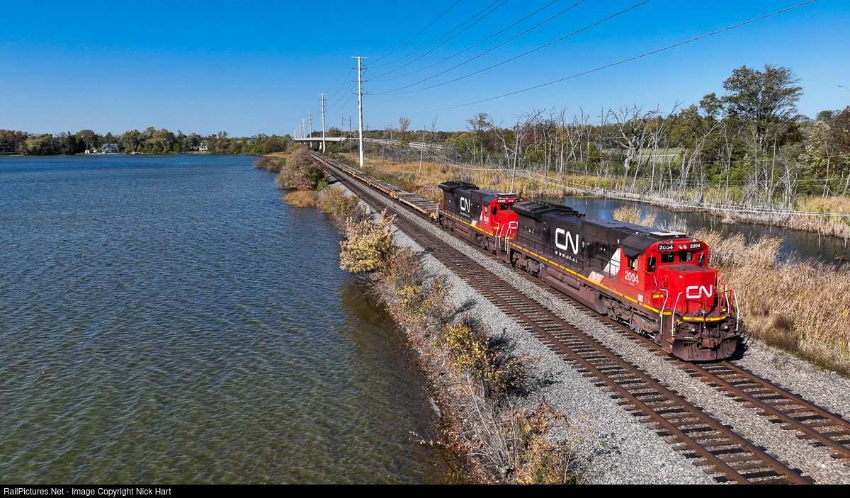 | After their time on the Iron Range came to an end, CN C40-8's 2004 and 2040 were tasked with taking a train of empty military flats to Centralia. They are seen skirting Cedar Lake in Lake Villa, on their way south. Upon arriving into Centralia, the units were placed into long term storage. |