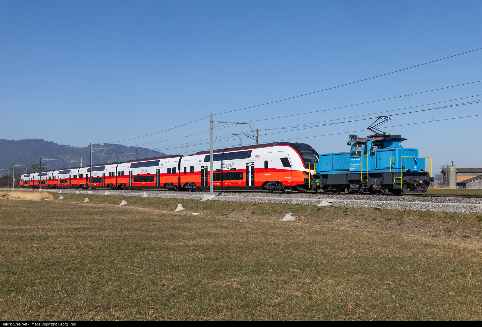 | Dual power (electro/battery) locomotive Eea 936 # 131 of StadlerRail pulls transfer train 32441 from St.Margrethen to Oberriet, between Altstätten and Oberriet. The load is the six-car doubledeck "CityJet" 4736 # 004 for the austrian ÖBB built by StadlerRail. The train will be parked in Oberriet in a siding for some time before delivery. |