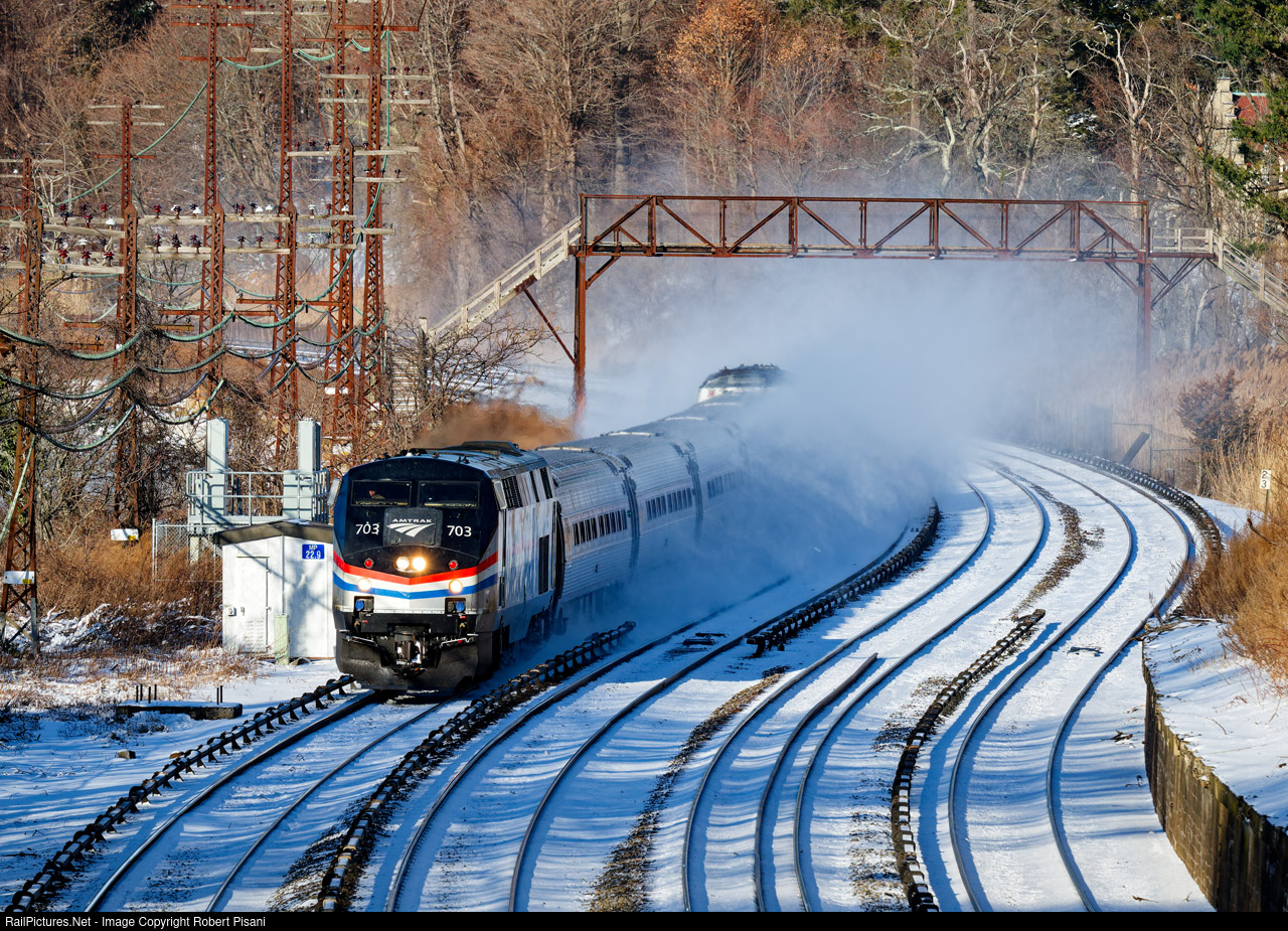| Amtrak Empire Service train 284 from Niagara Falls negotiates the S-curve at Irvington, NY on track 4 of the Hudson Line. On this day 284 was running with power on both ends of the consist. |