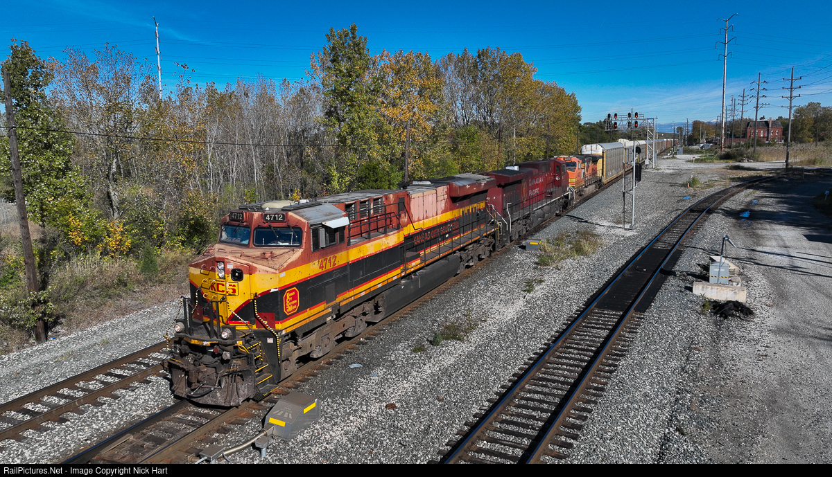 | KCSM, CP and BNSF GE's are in control of a westbound vehicle train as they pass through Dolton, bound for IHB's nearby Blue Island Yard. |