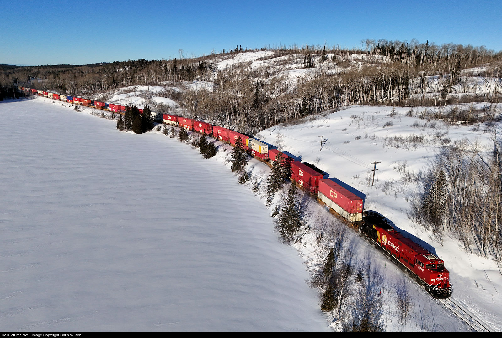| CPKC Railway's Vancouver IMS, BC to Toronto Vaughan IMS, ON stack train 100 makes its way up Hemlo Hill and along a frozen Cache Lake |