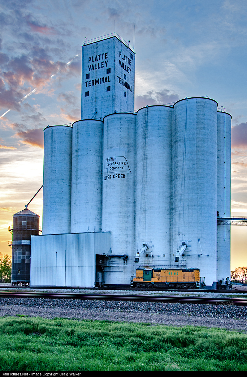 The Frontier Cooperative Company's grain elevator in Silver Creek NE has GP7 DDDX 4162 assigned to it to handle car switching. (DDDX is the AAR reporting mark for Frontier Cooperative Co.) This locomotive, as can easily be deduced from its yellow and green paint, previously belonged to the Chicago & North Western (CNW 4162). The CNW acquired it from the Rock Island, where it was RI 4508 (the first locomotive to be painted in the "ROCK" blue scheme), built by EMD in July 1952 as RI 1260. (Silver Creek, Nebraska – May 15, 2013)