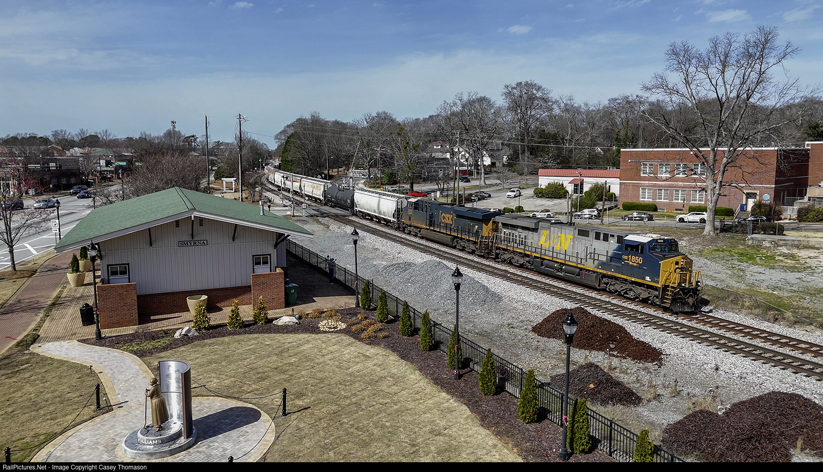 | The L&N heritage unit leads CSX train M54106 through Smyrna, Georgia, passing the old L&N depot which now houses the Smyrna History Museum. |