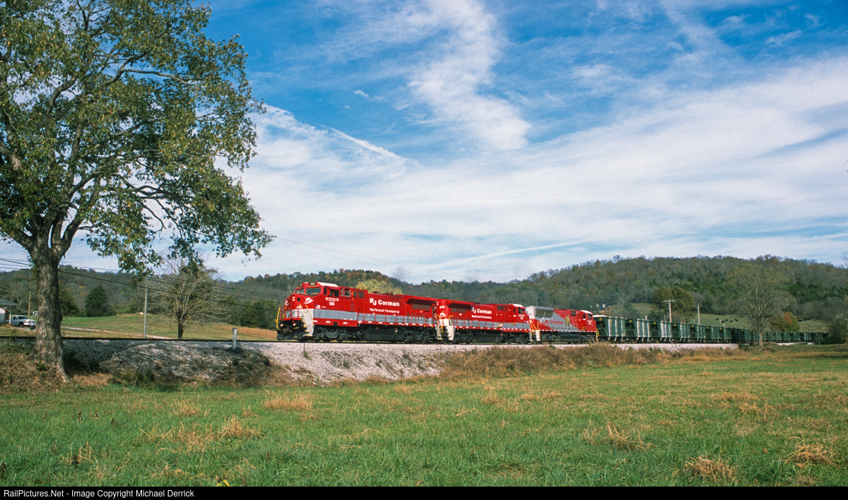 This is the present look of the Nashville & Eastern after the entire fleet has been repainted under RJ Corman ownership. Although this day's NE01 rock train is a bit different because one of the two SD70Ms is off the train which found a pair of B40-8Ws in its place. The typical power for this heavy train is a pair of SD70Ms and a 4-axle GE is added behind the 70s if the train will go to Bonnell Aluminum because that spur is limited to 4-axle power. The train is westbound through Brush Creek on the scenic former Tennessee Central mainline with loaded rock from the Rogers Group quarry in Gordonsville, TN bound for unloading in Nashville. The train is based in Lebanon, TN and alternates days between going east to the quarry and west to the unloading facility just east of downtown Nashville.