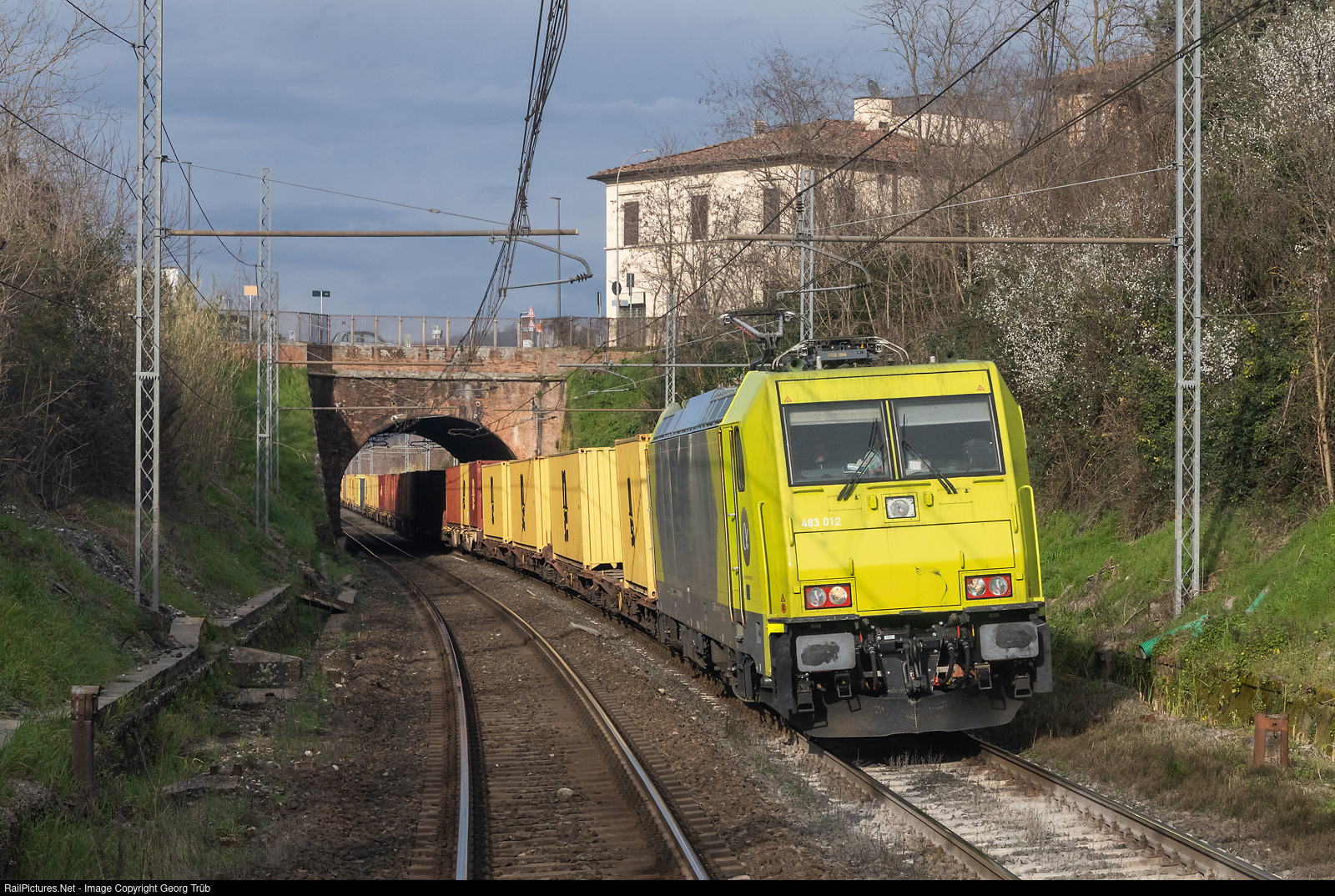 | The semi-circular viewing platform at the top of the ETR # 252 “Arlecchino” of the Fondazione FS Italiane with 8 swivel seats allows passengers to travel from the driver's perspective. Train encounter on the line between Pisa and Empoli with a freight train with Bombardier TRAXX F140 DC E 483 # 012 of Alpha Trains, hired to Medway Italia. |