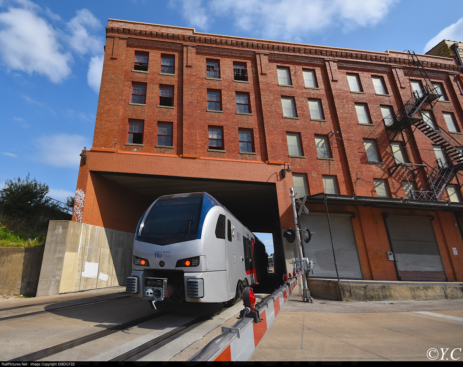 A TexRail commuter train passes through the Trinity Metro headquarters as it approaches Fort Worth Central Station.