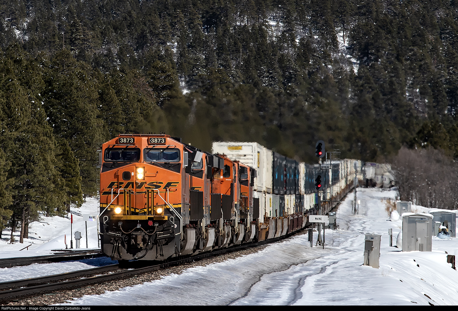 | Four GEs hustle a hot Willow Spring, IL to San Bernardino, CA Z1 as it drops down into Maine and descends down the Arizona Divide. Fresh snow has started to melt away from a late winter snow storm. |