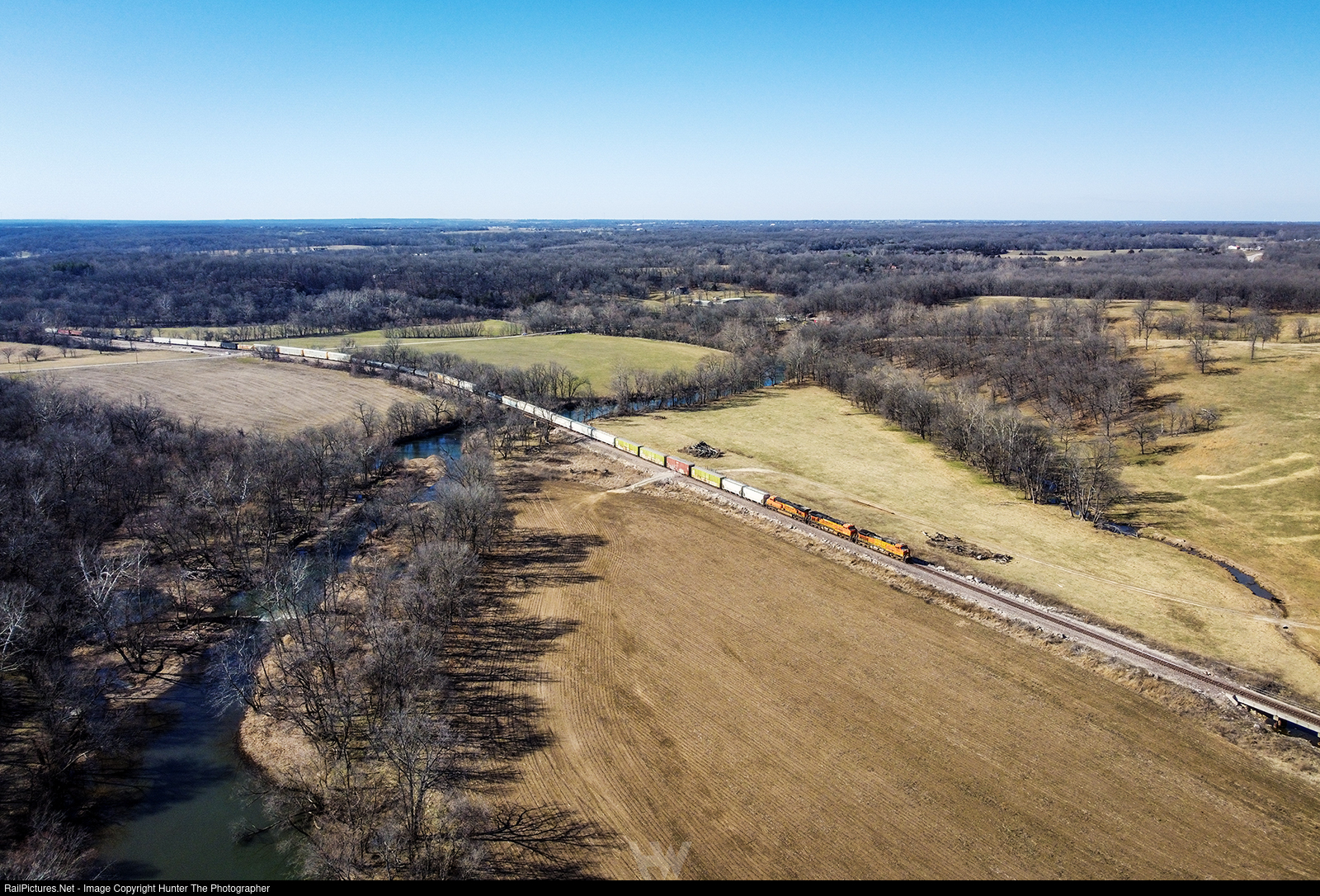| An eastbound BNSF manifest train cruises through fields just north of Granby, MO on the sunny afternoon of Sunday, March 9, 2025. |