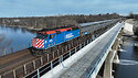 | Metra 107, the City of Oak Forest, cruises over the Fox River in Geneva. UP is in the process of triple tracking the area. |