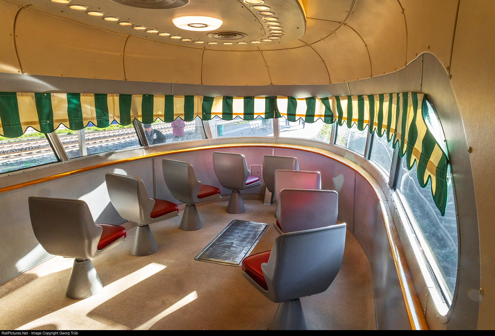 The Italian express train ETR # 252 “Arlecchino” of the Fondazione FS Italiane, built in 1960 by Breda in Milano for the Italian state railroad Ferrovia dello Stato, has a semicircular viewing platform at both ends with 8 freely rotating seats as well as a comfortable bench with 3 seats, which allow a wonderful view of the tracks and the landscape. A small pulpit is built above it for the locomotive crew. Here in Roma Ostiense, before the departure of the train via Civitavecchia-Pisa-Prato-Bologna to Milano Centrale, the rear viewing platform is still empty. It is clear that with today's crash regulations, this type of construction would no longer be possible.