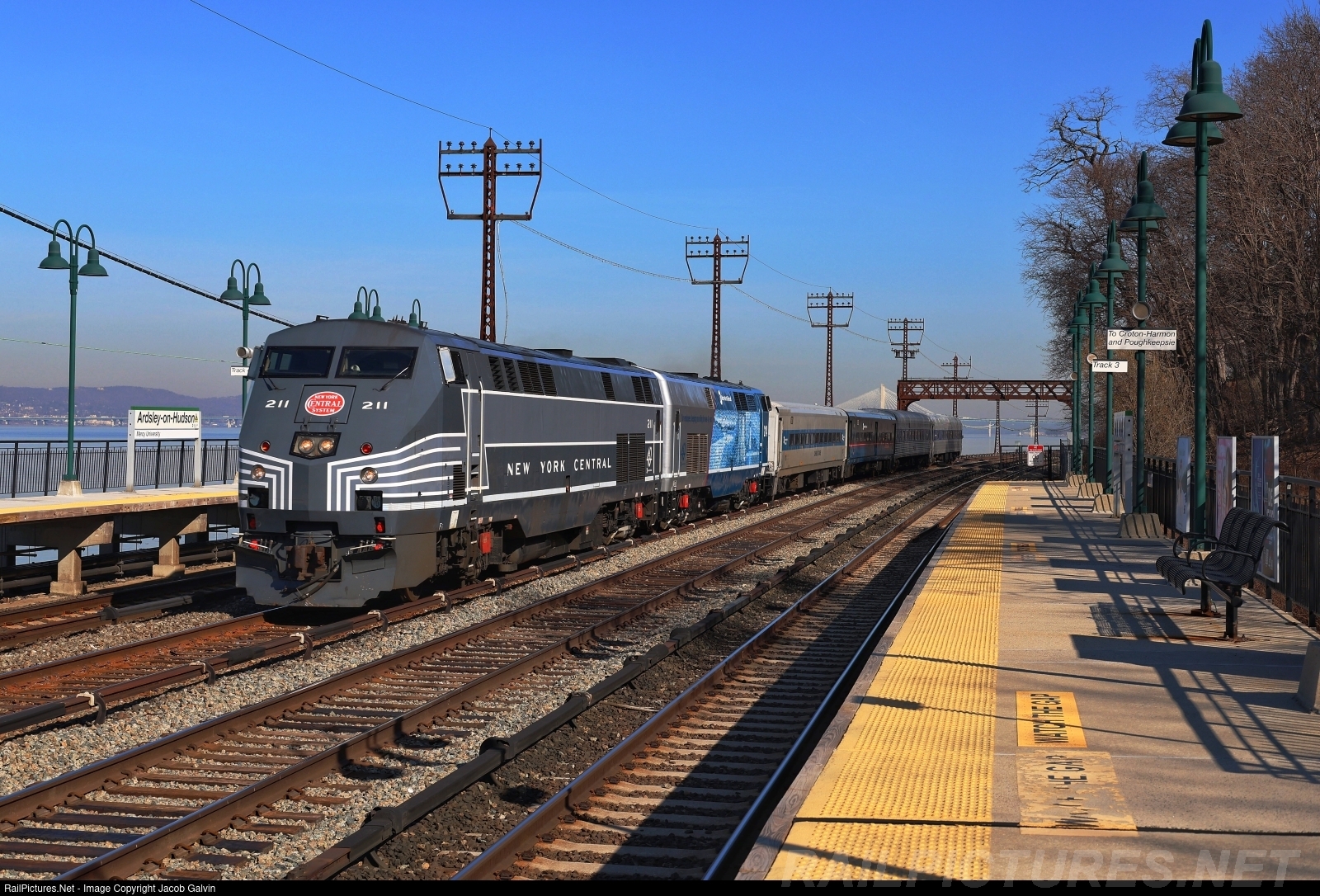 | Metro North 211 & 214 the New York Central & Employee Appreciation GE P32AC-DMs lead an OCS train south through Ardsley-on-Hudson during the morning of March 11th, 2025. |