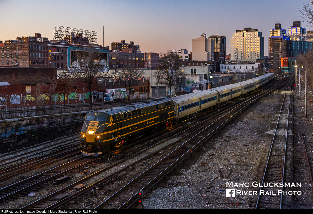 Sunday Sunrise With the NYNH&H. MTA Metro-North Railroad Train 8805 was led by the railroad's newest heritage unit, P32AC-DM MNCW 222 (New Haven) on the early morning of Sunday, March 9, 2025. This unit commemorates an early New York, New Haven & Hartford Railroad locomotive paint scheme with its distinctive script logo. This is the sixth Metro-North Railroad wrap, and it joins the four Connecticut DOT New Haven (McGinnis/Matter) tribute units. Because of weekend work on the Park Avenue Viaduct, the Poughkeepsie bound train is a bit further over to the east than usual as it passes through Mott Haven in the Bronx, New York about 15 minutes before sunrise. Construction in the area has brought a number new high-rise construction building to the neighborhood in recent years, as can be seen in the background.