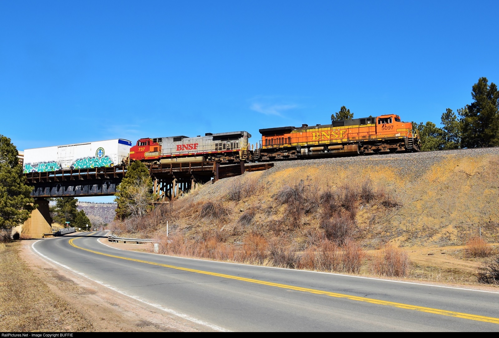 | A pair of GE Dash-9 motors, including former AT&SF Warbonnet 737, runs over the Santa Fe Bridge in Larkspur, Colorado.