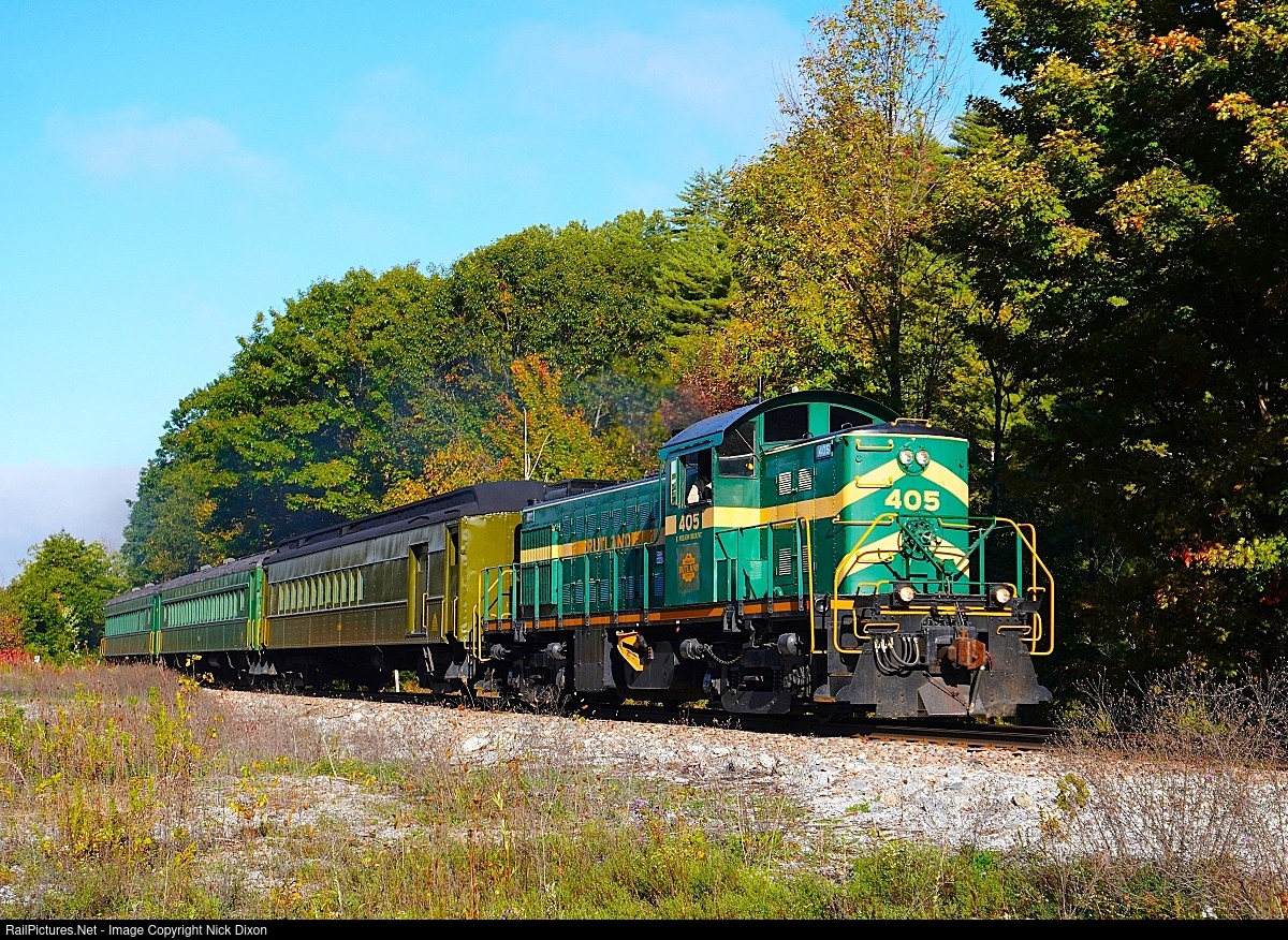 In honor of VRS's 60th anniversary, Trains Magazine hosted a 2-day charter that used Green Mountain Railroad RS-1 #405, put back in it's original Rutland lettering, to run from Rutland to Bellows Falls on Saturday and Rutland to Burlington on Sunday. I hung around Monday to catch the #405 making the deadhead move back to North Walpole, and caught it at Shrewsbury, just before crossing VT-103.