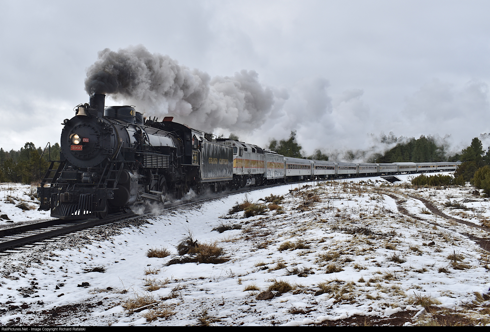 | With a light drizzle falling and the snow actively melting, the margins of pulling this shot off were extremely slim, but lasted just long enough for success. With a fully loaded 15 car (16 if you count the power car) train in tow, 4960 charges ahead through the snow bound for the south rim of the Grand Canyon |