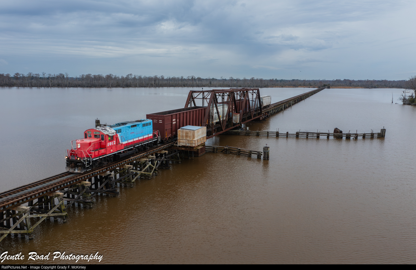 Carolina Coastal Railway's 119 job crosses the Pamlico River with 5 cars for various industries along the former N&S mainline in eastern North Carolina.