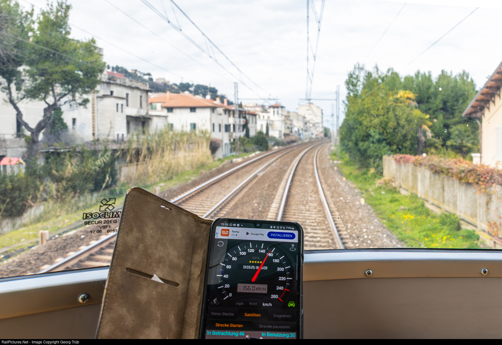 | The semi-circular viewing platform at the top and rear of the ETR # 252 “Arlecchino” of the Fondazione FS Italiane with 8 swivel seats allows passengers to travel from the driver's perspective or looking back to the tracks. The train is circulating at 156 km/h (97 mph) on the Adria main line southbound, the view goes backwards. The ETR # 252 is approved to run 160 km/h. |