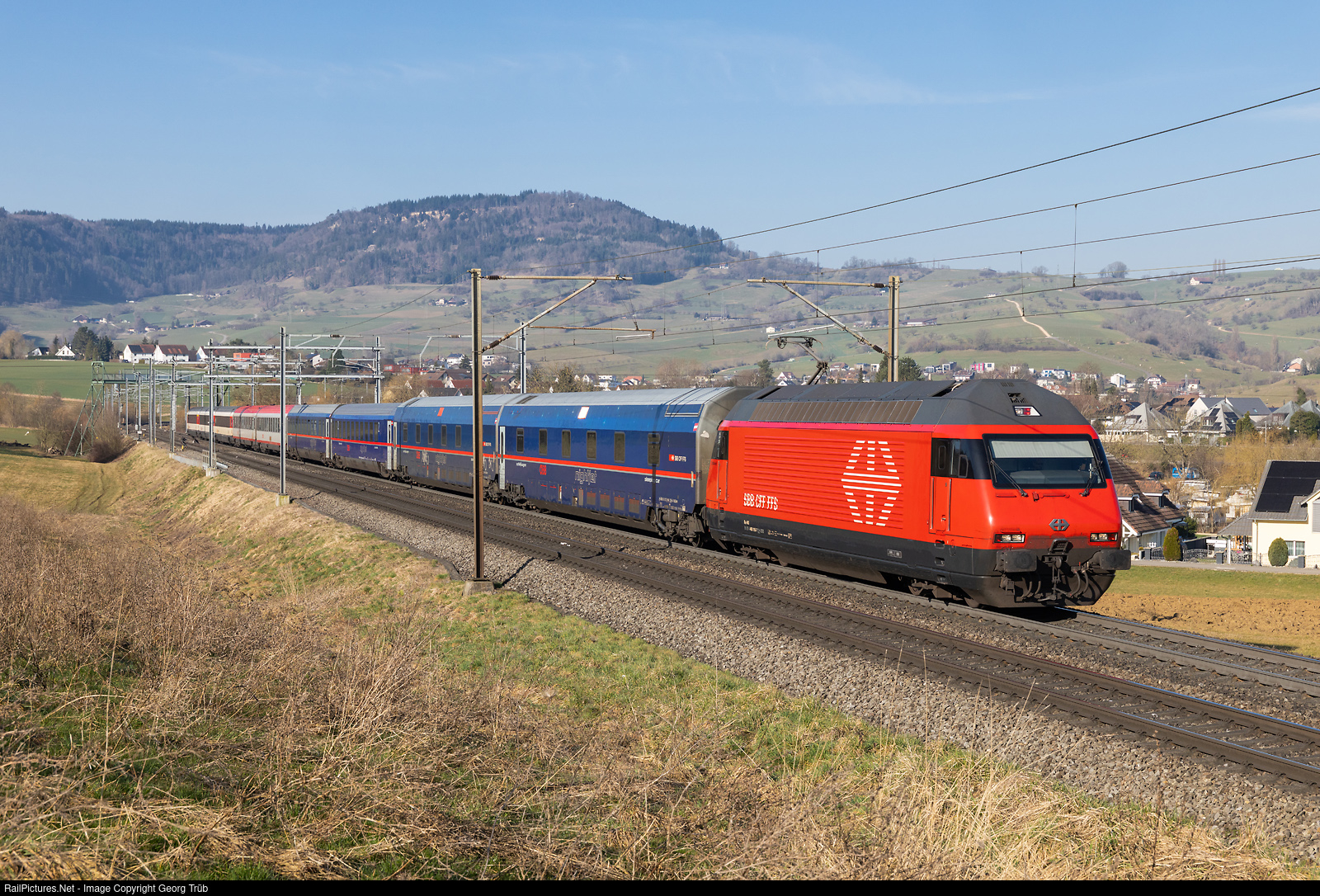 | Re 460 # 116 of the SBB pulls the NightJet NJ 471 from Hamburg Altona via Basel to Zürich on the Bözberg north ramp between Frick and Hornussen. In front the doubledeck bed cars WLBmz and WLABmz, followed by the couchette cars of the austrian ÖBB. Then seat cars of the ÖBB and seat cars of the SBB. |