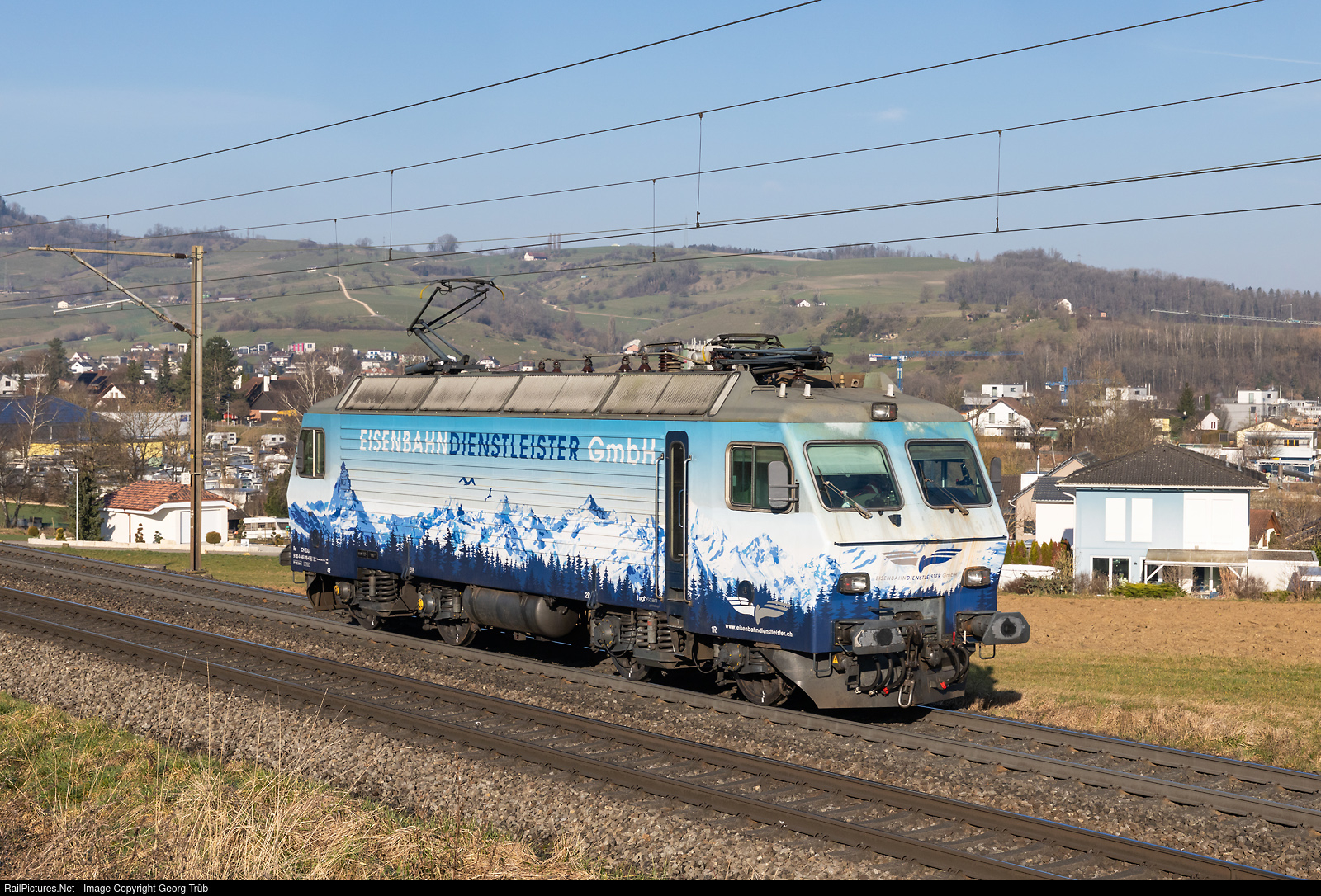 Former SBB Re 4/4 IV # 10104, built in 1982 by SLM and BBC with 4960 kW, from 1996 owned and operated by the Südostbahn as Re 446 # 448, then EDG (Eisenbahndienstleister Gmbh) Re 446 # 018, is now operated by TXLogistik. The locomotive is running light on the Bözberg north ramp between Frick and Hornussen, on the way from Rheinfelden to Wil SG, to pull an empty tank car train to Kork.