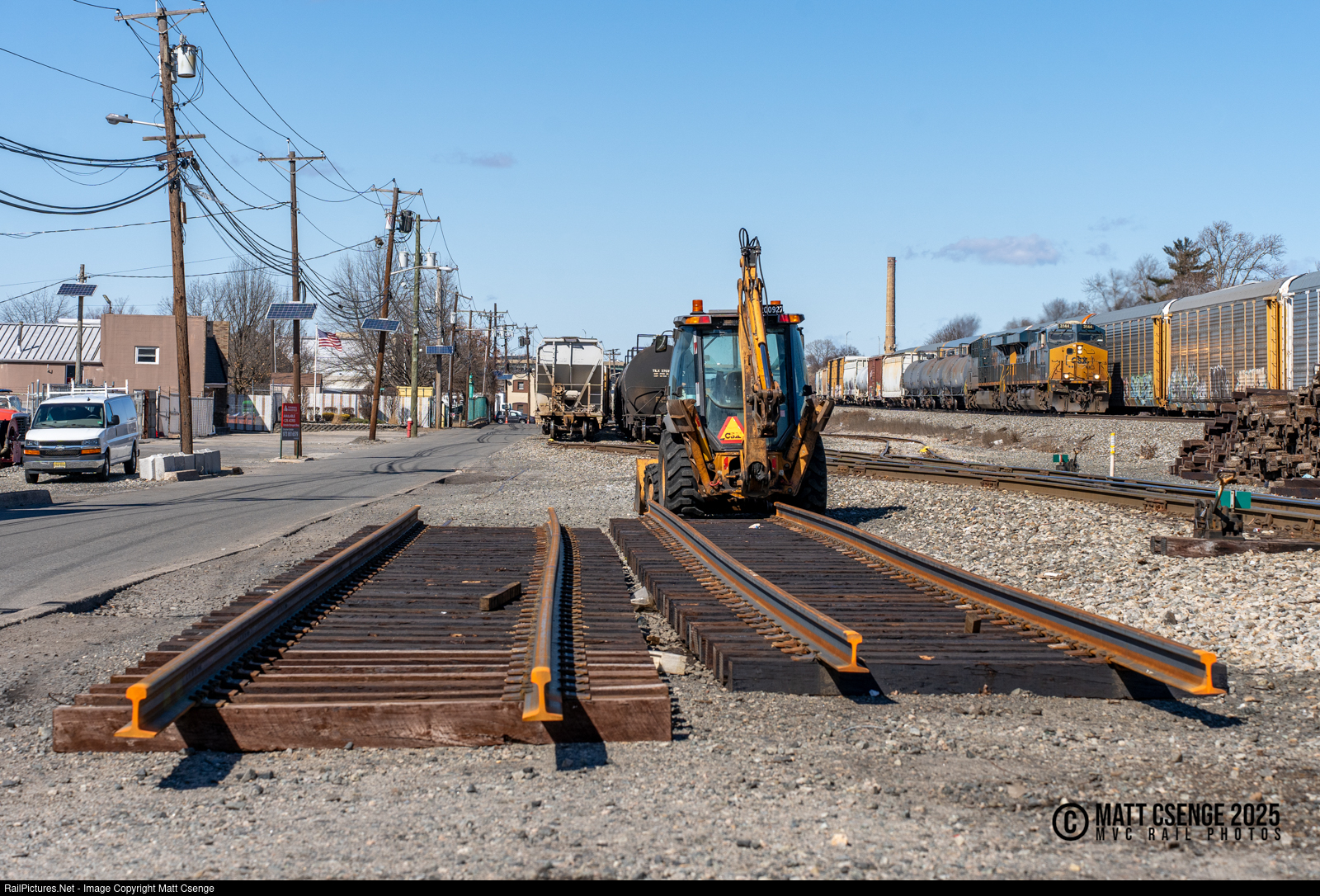 CSX AC44CW no.s 3144 and 3133 are seen descending the grade into Ridgefield Park, NJ, passing a pair of prefabricated track panels lying near the Mt Vernon Street grade crossing. The panels were built in preparation for replacement of the grade crossing, which would be shut down in the coming days, per construction signage nearby.