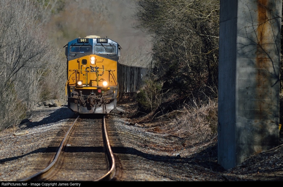 | CSX #981 rolling through the straight at Speers Ferry utilizing NS trackage rights in Westbound direction from Frisco. The visible structure to the right happens to be the pier for CSX's Kingsport Subdivision, which crosses directly over this line. |