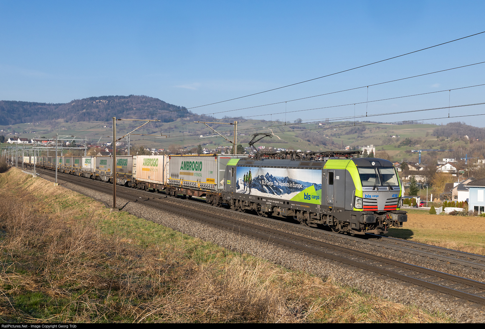 | Siemens "Vectron" Re 475 # 416 of BLS Cargo pulls the southbound Ambrogio intermodal train 42661 from Neuss Hesentor/Germany via Basel-Gotthard-Luino to Gallarate/Italy (Busto Arsizio Terminal) on the Bözberg north ramp between Frick and Hornussen. |