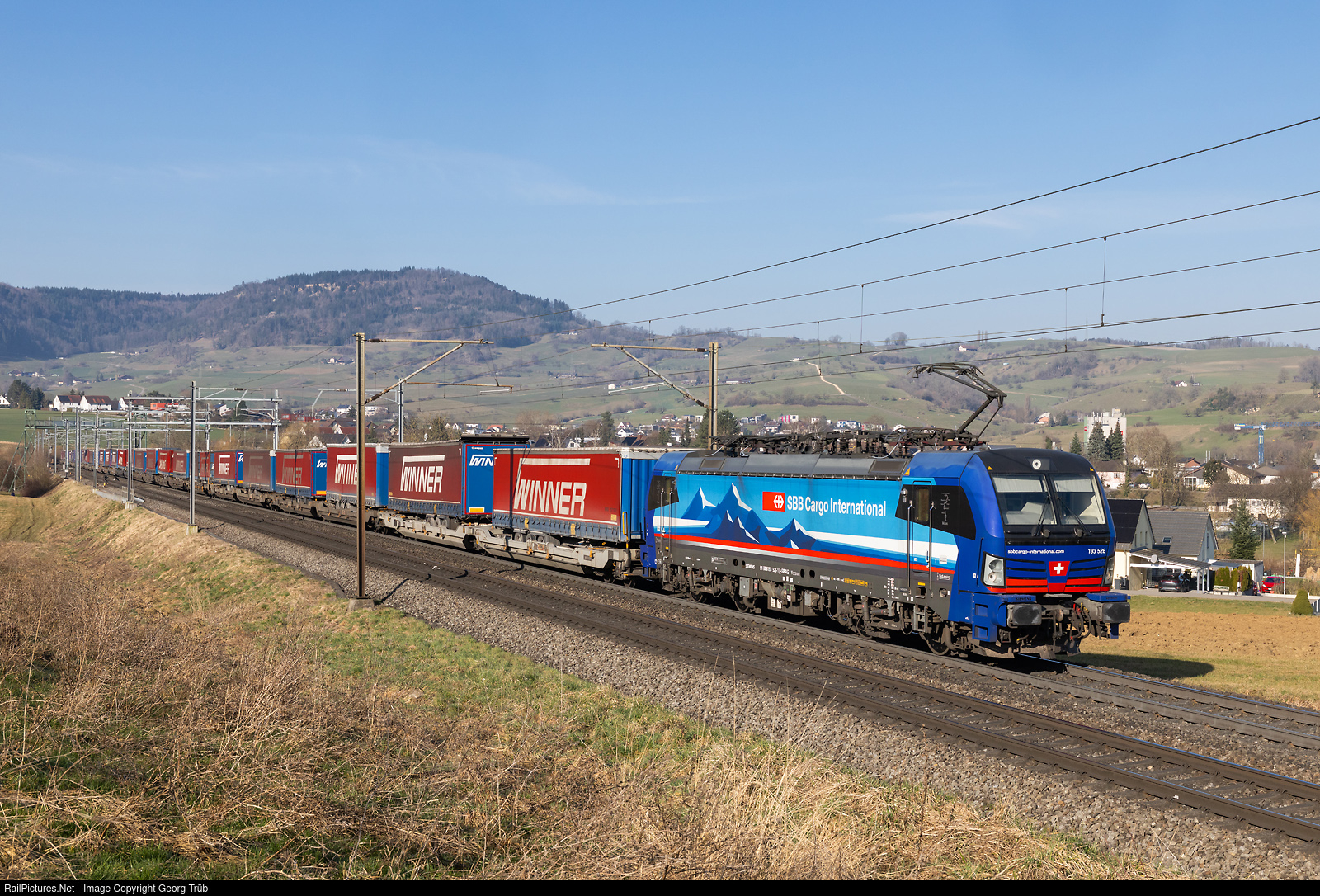 | Siemens "Vectron" 193 # 526 of SBB Cargo International, rented from the SüdLeasing, pulls the "Winner" intermodal train 42001 from Wuppertal/Germany via Basel-Gotthard base tunnel-Ceneri base tunnel-Chiasso to Piacenza/Italy, on the Bözberg north ramp between Frick and Hornussen. |