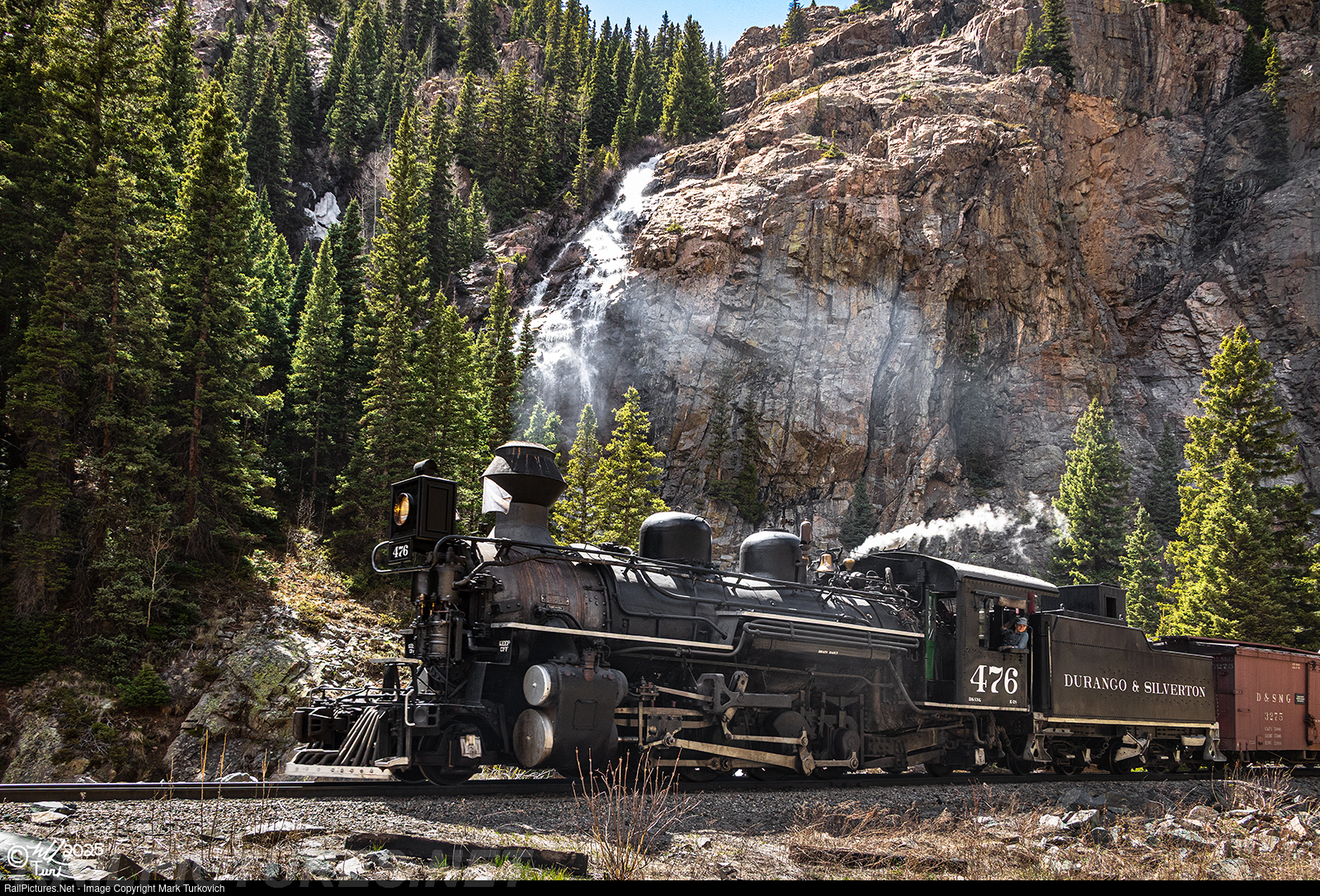 Durango & Silverton 476 hustles past Cataract Falls as it starts the return trip back to Durango.