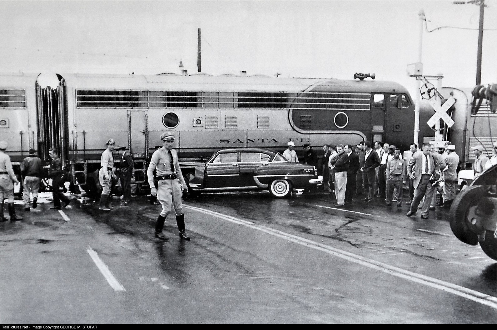 San Diego PD motorcycle officers are seen investigating a fatal collision involving a four door sedan and AT&SF motive power on November 4th 1957. Photographer unknown, from my collection.