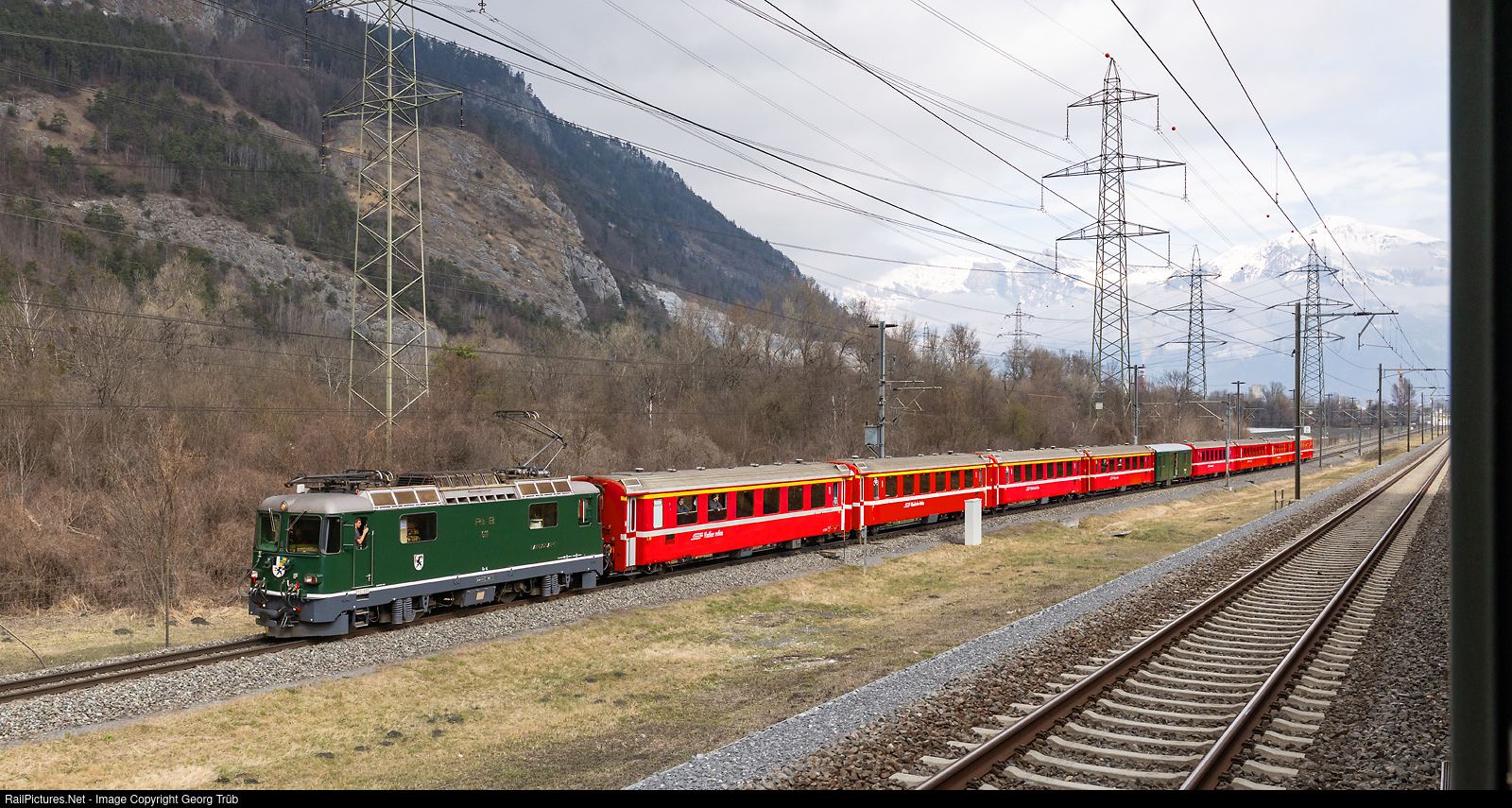 Under the motto “Green and Chrome”, the Eurovapor association, together with the Mikado 1244 association and the RhB/Grün and Chrom foundation, organized a day trip from Brugg to Chur with a round trip through Graubünden. From Brugg via Zurich-Winterthur-Weinfelden-Rorschach-Sargans to Chur, the Ae 6/6 # 11407 “Aargau” of the Mikado 1244 association (on loan from SBB Historic) pulled the sold-out train with 4 carriages. In the canton of Graubünden, the Ge 4/4 II # 611 “Landquart” in green hauled a 9-car train with standard coaches type II in first and second class as well as the baggage car D # 4205 in green, which served as a bar car, from (Landquart-) Chur via Reichenau-Thusis-Filisur-Davos-Klosters to Landquart, from where the return journey was made on the same route with the train of the Mikado 1244 association. Between Zizers Altlöser crossing station and Chur, the two trains ran in parallel for around 10 minutes over a distance of around 10 kilometers. Here you can see RhB train 92511 on meter gauge running at around 60 km/h from the parallel running special train 31000 on standard gauge between Untervaz and Haldenstein.