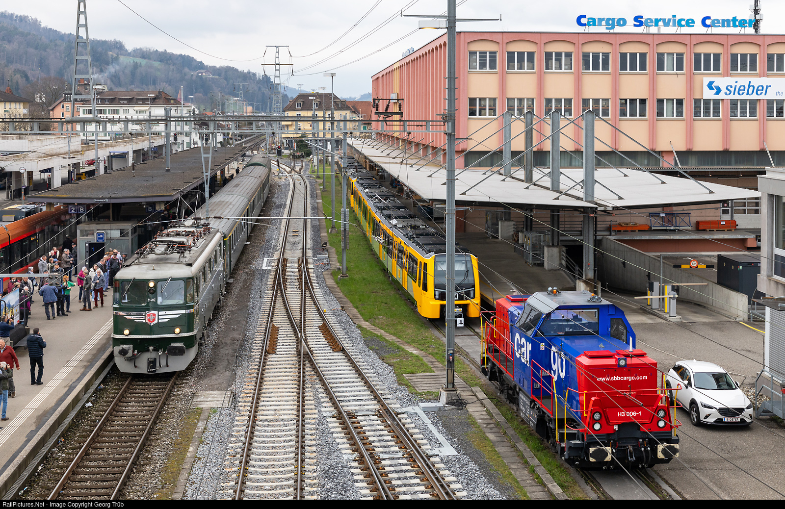 Under the motto “Green and Chrome”, the Eurovapor association, together with the Mikado 1244 association and the RhB/Grün and Chrome foundation, organized a day trip from Brugg to Chur with a round trip through Graubünden. From Brugg via Zurich-Winterthur-Weinfelden-Rorschach-Sargans to Chur, the Ae 6/6 # 11407 “Aargau” of the Mikado 1244 association (on loan from SBB Historic) pulled the sold-out train with 4 carriages. The train reached St.Margrethen for a photo stop. On the right are new metro trains built by StadlerRail for the british Tyne and Wear Metro in Newcastle, and the shunting locomotive H3 Ama # 006 with diesel and battery drive of the SBB, built by Alstom.