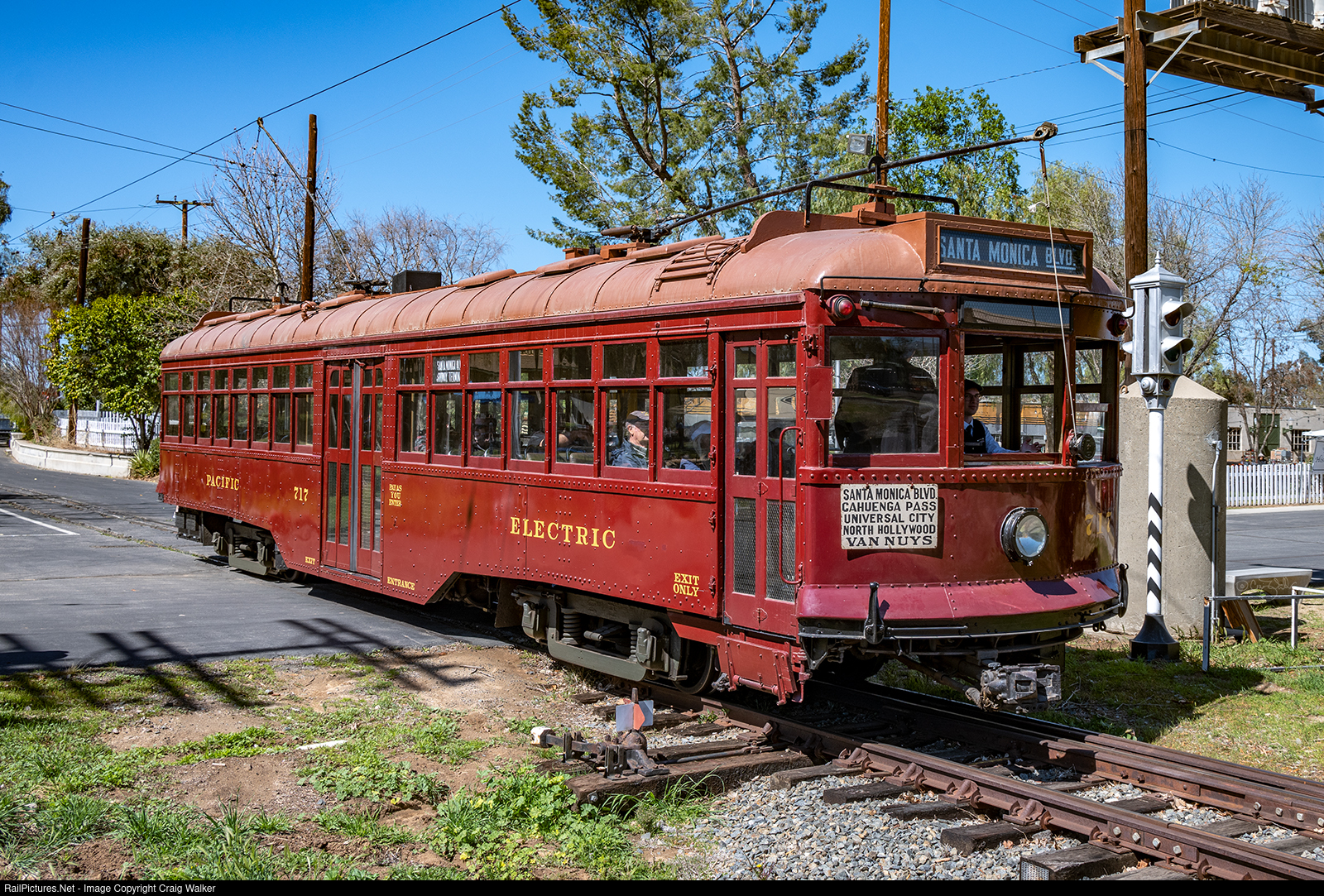 In 1960 Orange Empire Trolley Museum member Walter Abbenseth purchased five of the 600-class "Hollywood" cars (LAMTA 1801 [ex-PE 637], 1803 [ex-PE 635], 1812 [ex-PE 626], 1814 [ex-PE 716] and 1815 [ex-PE 717]), with PE 717 being in the best condition and repainted into the PE's red and cream "Valley Seven" colors. In the 1990s, as part of an extensive restoration, PE car 717 (the now-Southern California Railway Museum's only operating "Hollywood" car) received a new paint job replicating the Pacific Electric's original dark red paint scheme, as seen here operating in the car's centennial year. (Perris, California – March 8, 2025)